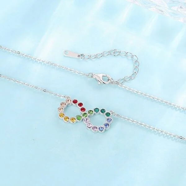 En esta ocasión tiene el diseño INFINITO, el cual posee un increíble y a la vez delicado adorno de cristales de variedad de colores los cuales transmiten la alegría de la vida y como el arcoíris tiene un abanico de colores que equilibran todo lo que una mujer puede ser al mismo tiempo con sus matices y virtudes.